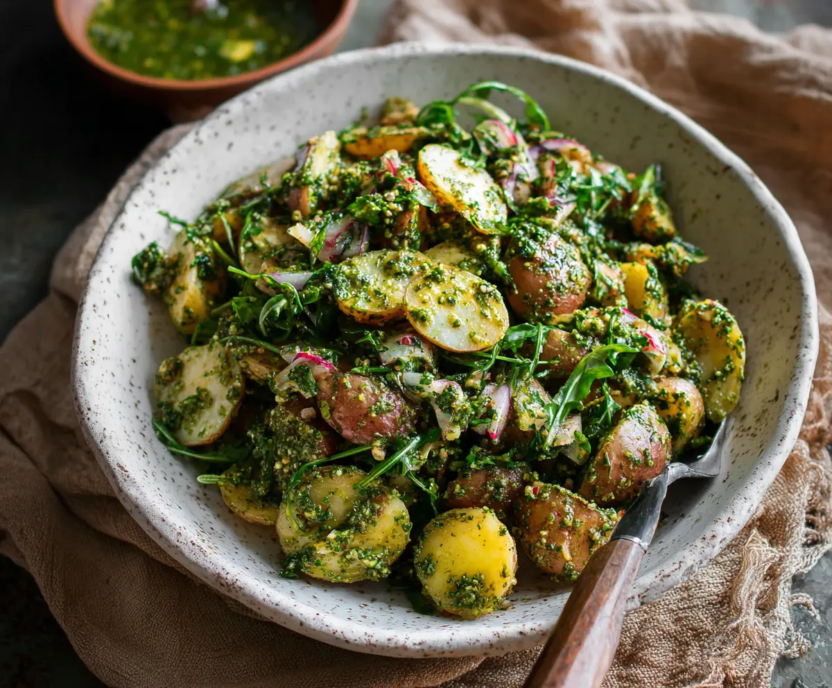 This vibrant and herbaceous Arugula Pesto Potato Salad is a fantastic side dish, balancing the tender potatoes with zesty, fresh pesto and crunchy nuts!