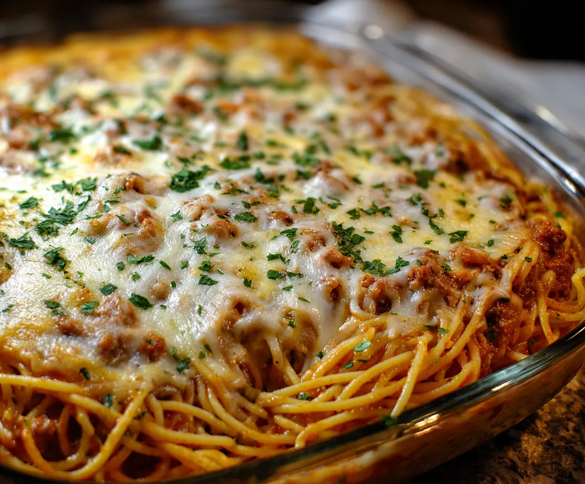 Enjoy this creamy, cheesy baked spaghetti casserole that combines the tangy richness of cream cheese with hearty meat sauce and melted cheese! It’s comfort food at its best!
