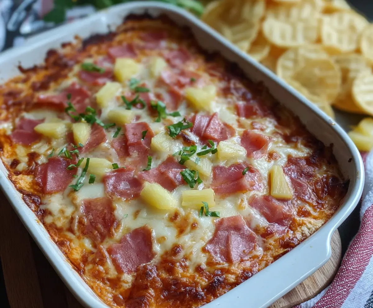 This warm and cheesy Baked Hawaiian Pizza Dip is sure to make everyone smile! With gooey cheese, tasty ham, and sweet pineapple, it’s like pizza in a bowl. Perfect for sharing at parties!