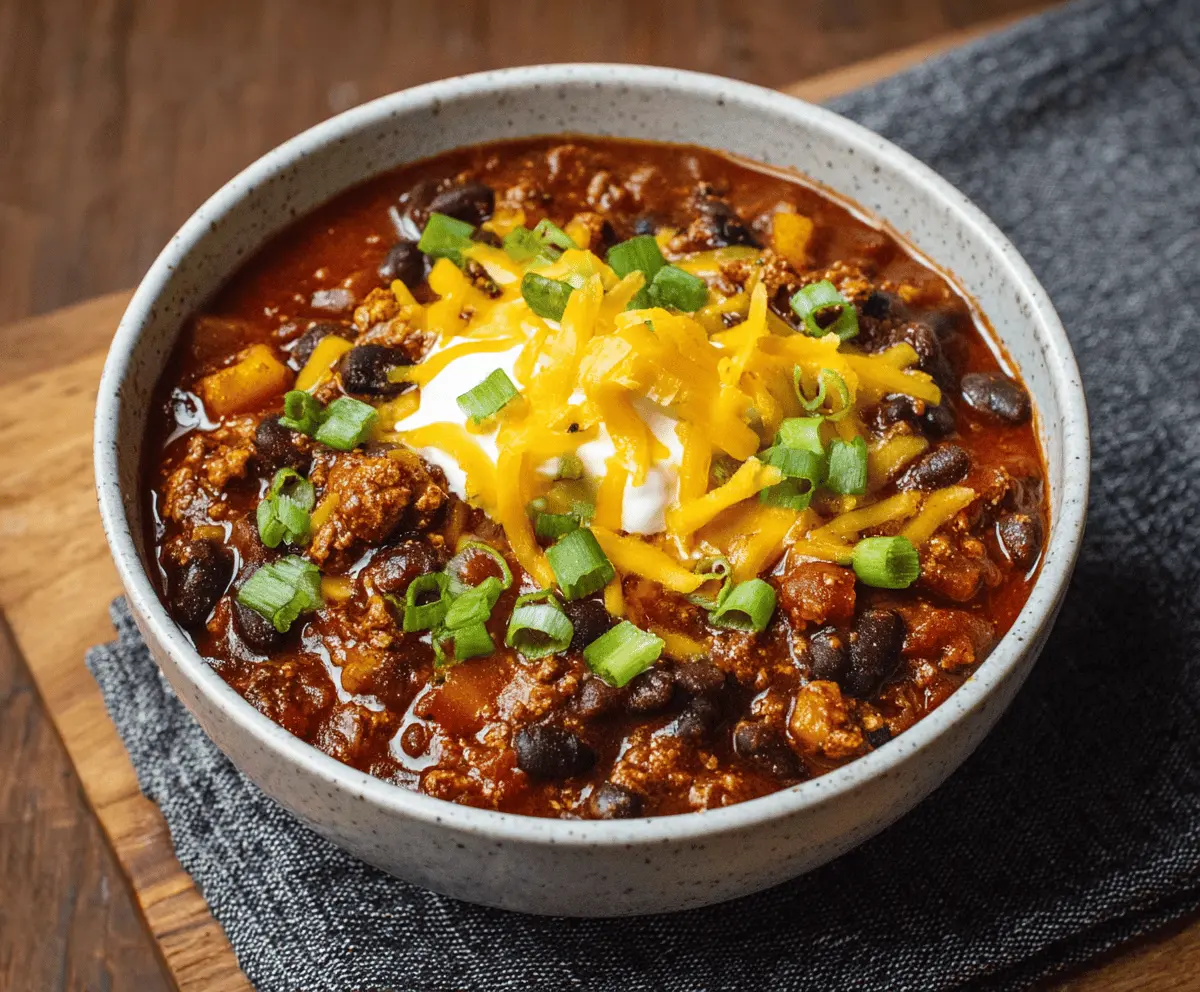 When you’re ready to eat, ladle the chili into bowls and top with shredded cheddar cheese, a dollop of sour cream, and chopped green onions. Enjoy your warm and hearty Black Bean Chili!