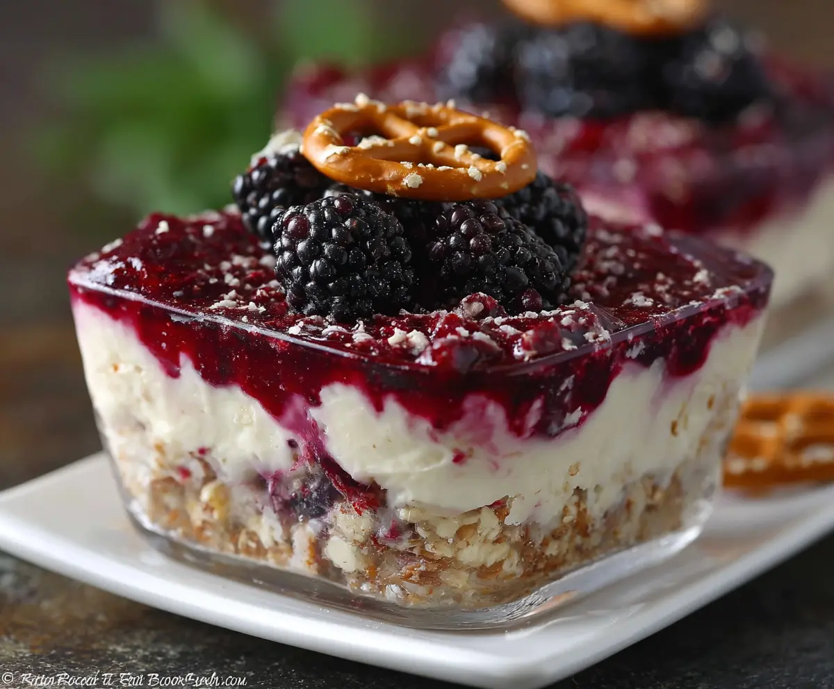 This Blackberry Pretzel Dessert is a fun and tasty treat! It has a crunchy pretzel crust, creamy filling, and sweet blackberry topping that make it a delight for your taste buds.