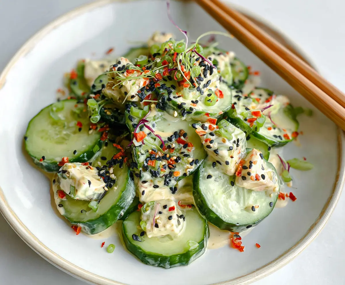 Top your salad with toasted sesame seeds (both white and black) and a sprinkle of tobiko or masago for an extra burst of flavor. Now, you can serve it right away, or for an extra touch, chill the salad in the refrigerator for 15-20 minutes to let all the flavors meld together. Enjoy your refreshing California Roll Cucumber Salad!