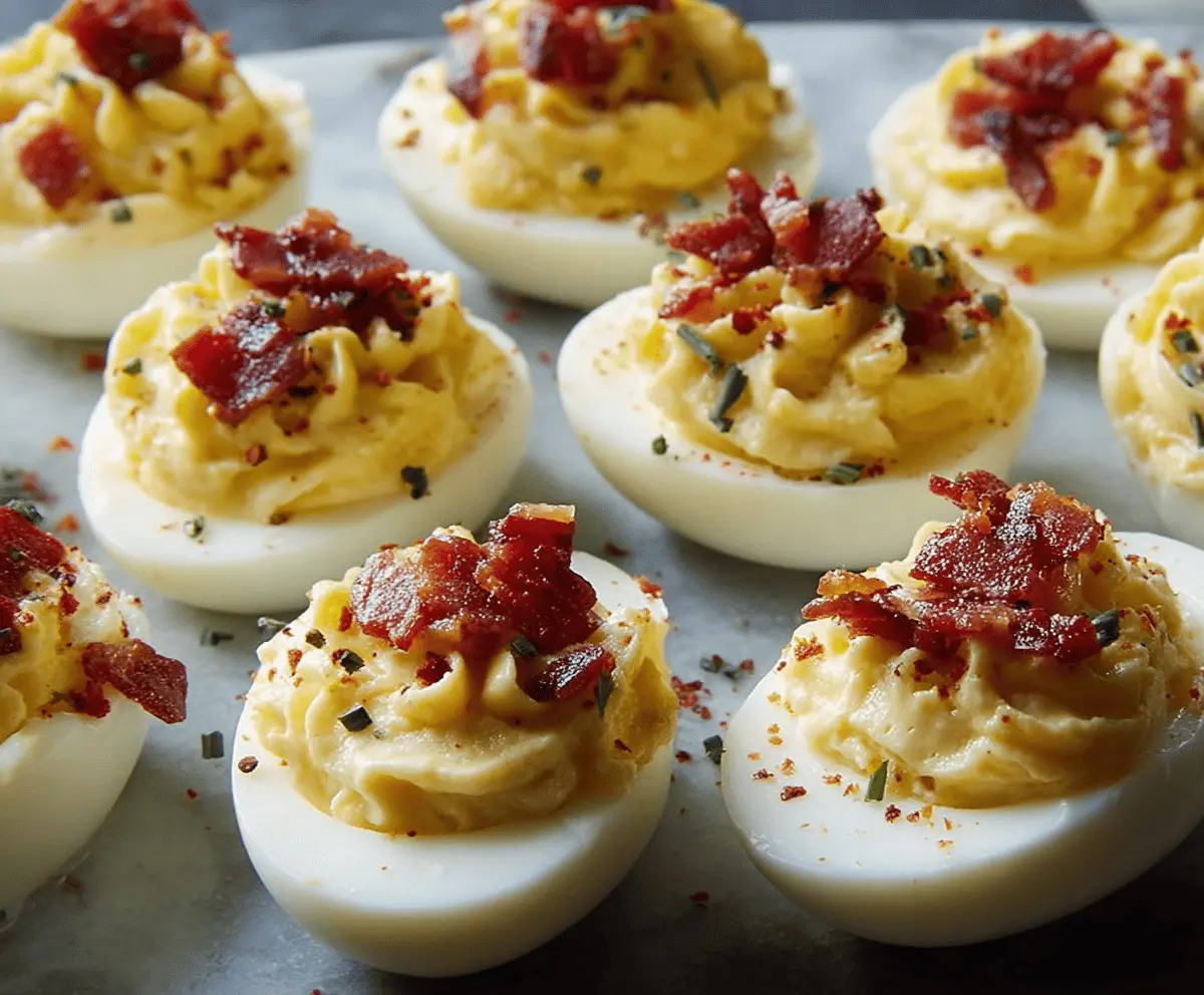 Carbonara Deviled Eggs bring a twist to the classic snack! With creamy yolks mixed with cheese, crispy bacon bits, and a hint of garlic, these are sure to impress your friends.