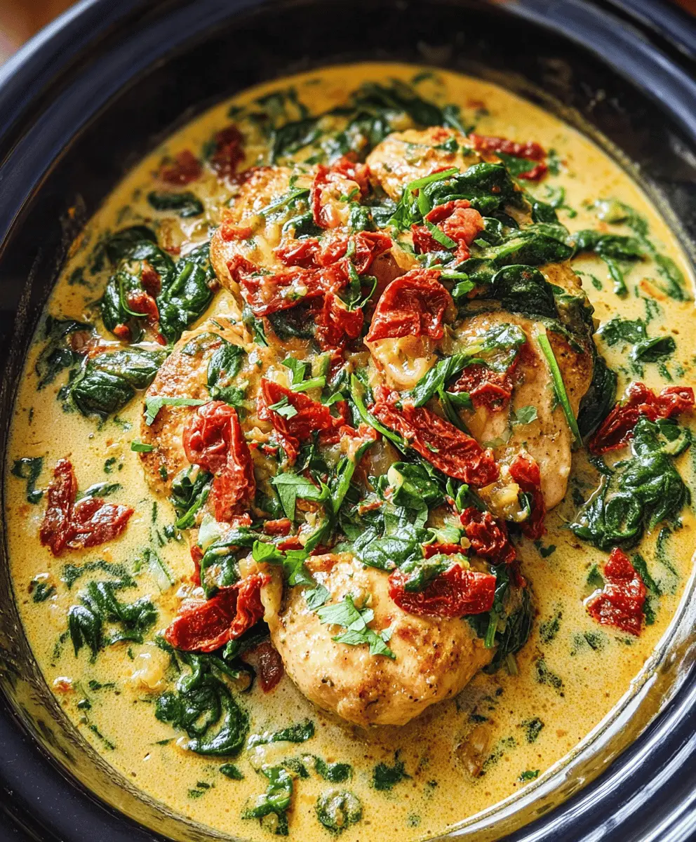 Easy Crockpot Tuscan Garlic Chicken With Spinach And Sun-Dried Tomatoes