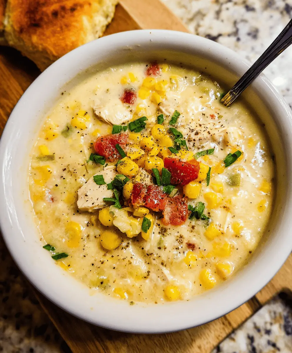 A bowl of creamy chicken noodle soup garnished with fresh herbs, featuring tender chicken, egg noodles, and a rich, savory broth.