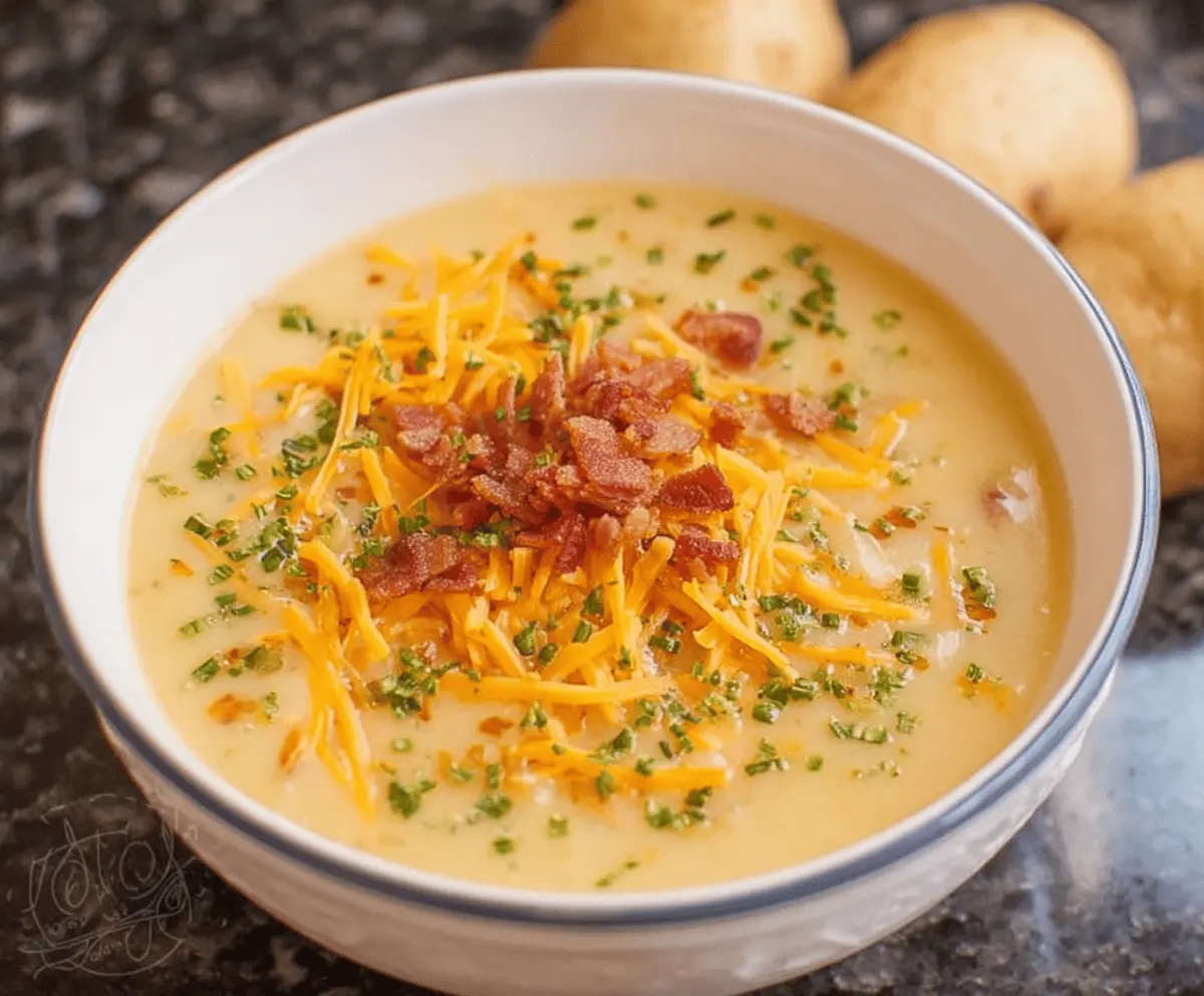 This rich and cheesy potato soup is perfect for a cozy meal, featuring tender potatoes paired with sharp cheddar and smoky bacon, finished with the freshness of chives. Grab a spoon and enjoy every comforting bite!