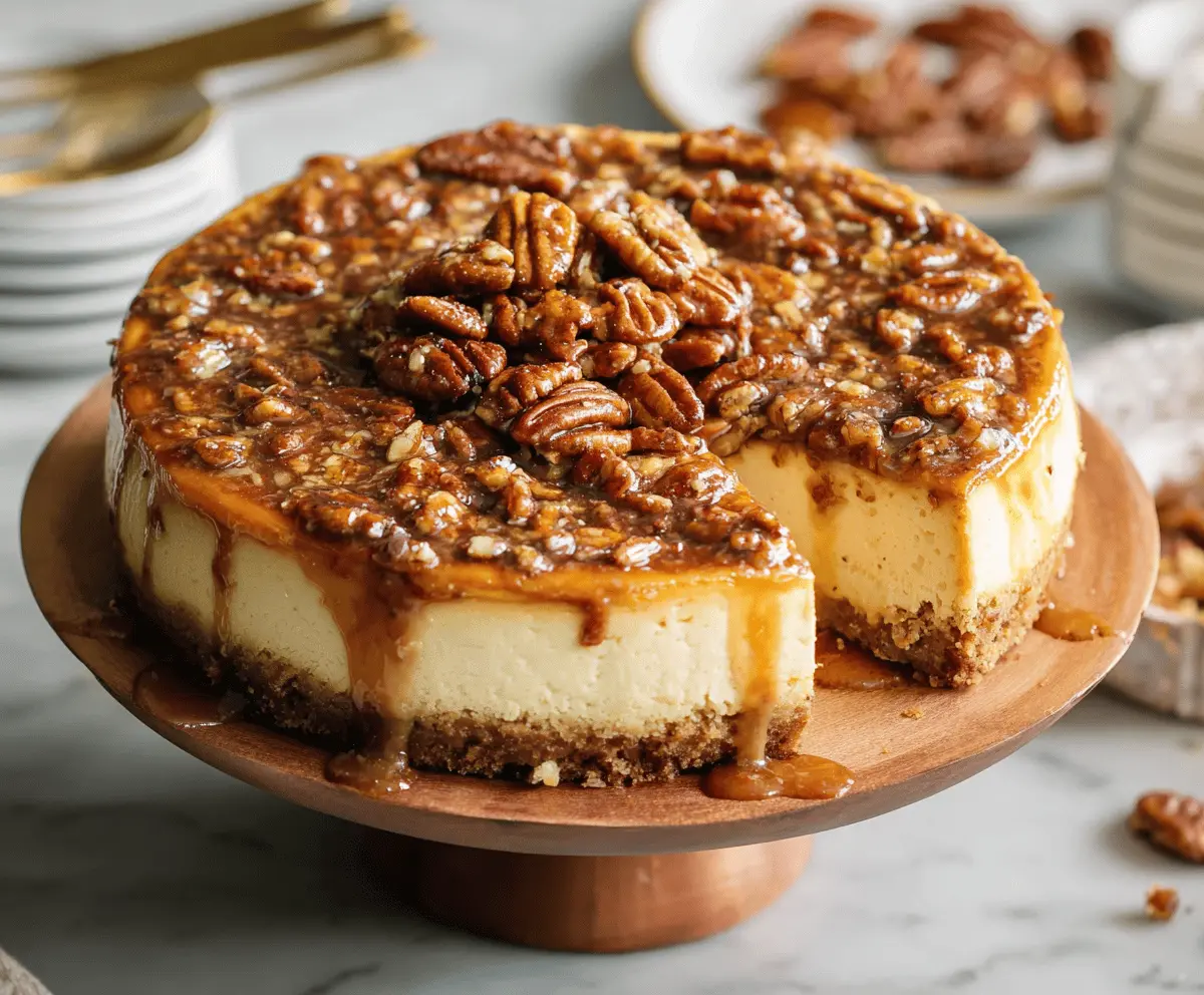 Enjoy the luscious, creamy cheesecake with the sweet, cinnamon-spiced pecan pie topping!