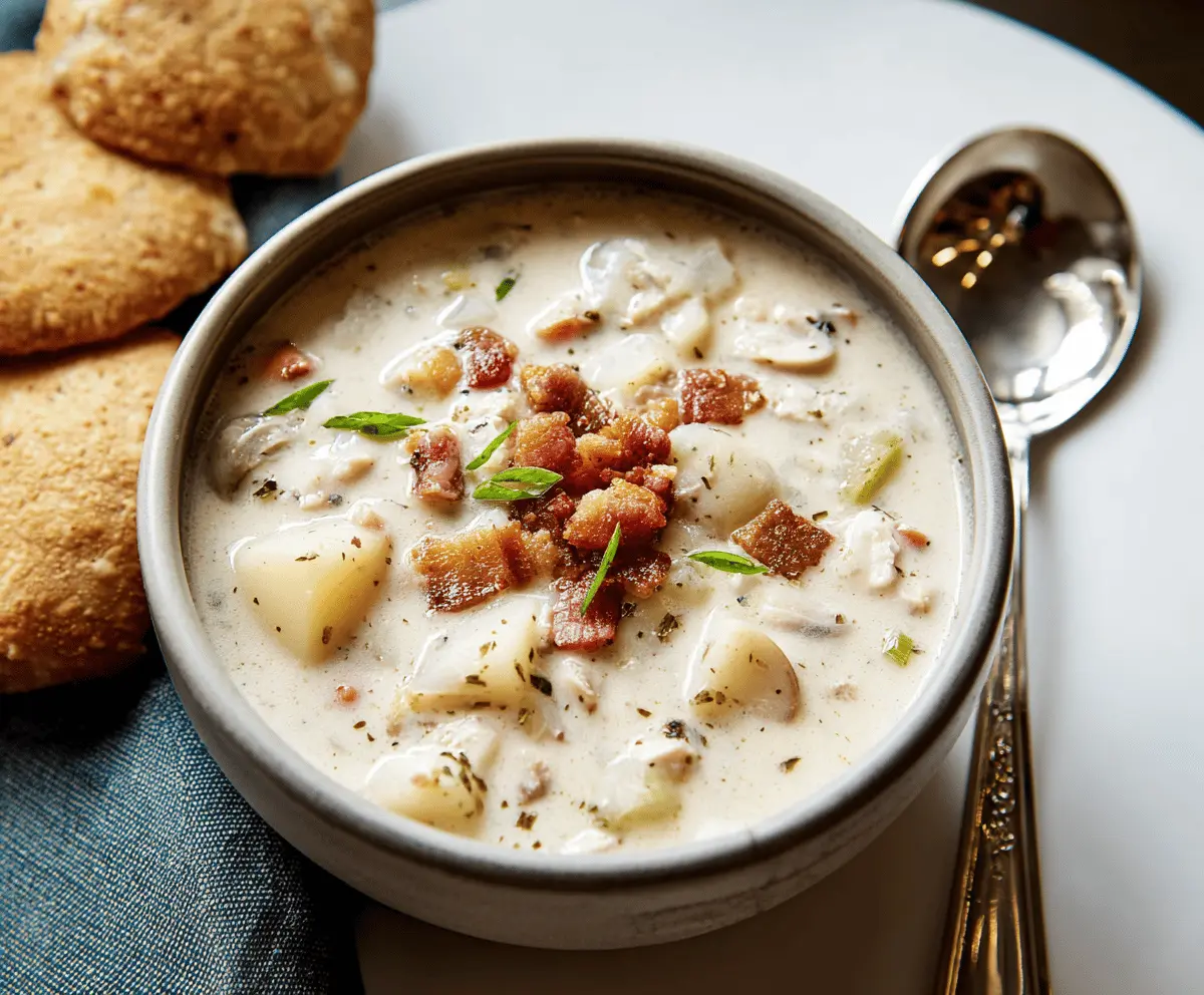 This rich clam chowder is creamy, filled with tender clams and hearty potatoes, and garnished with bacon and fresh herbs, making it the perfect coastal comfort meal!