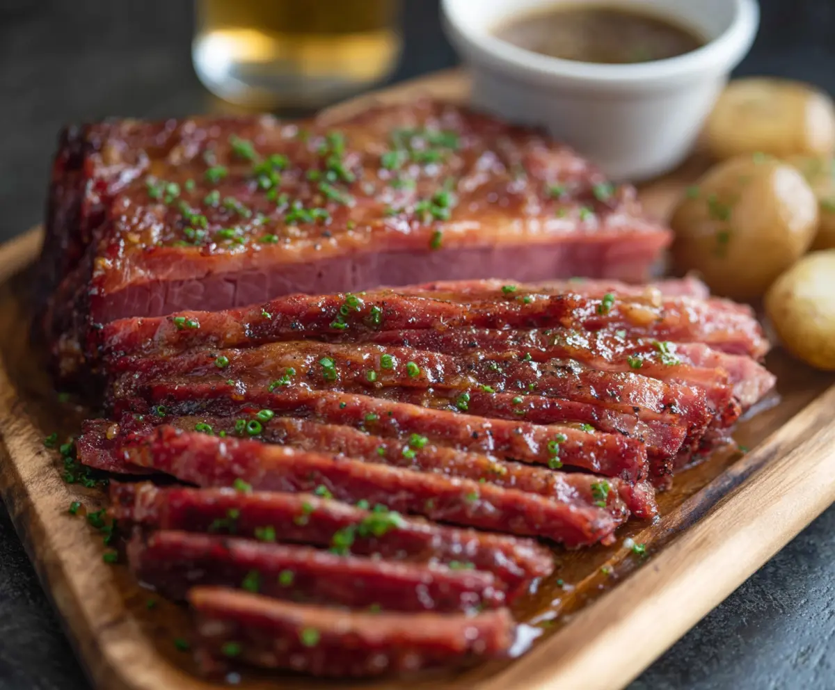 Serve the sliced corned beef garnished with fresh parsley for a pop of color. Pair it with boiled baby potatoes and the remaining beer glaze for dipping. Enjoy your tender, flavorful corned beef with a rich, sweet-savory beer glaze!