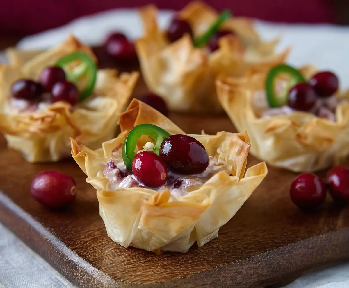 These Cranberry Jalapeno Phyllo Cups are a fun and tasty treat! Crunchy phyllo pastry holds a zesty mix of sweet cranberries and spicy jalapenos, making them a perfect bite-sized snack.