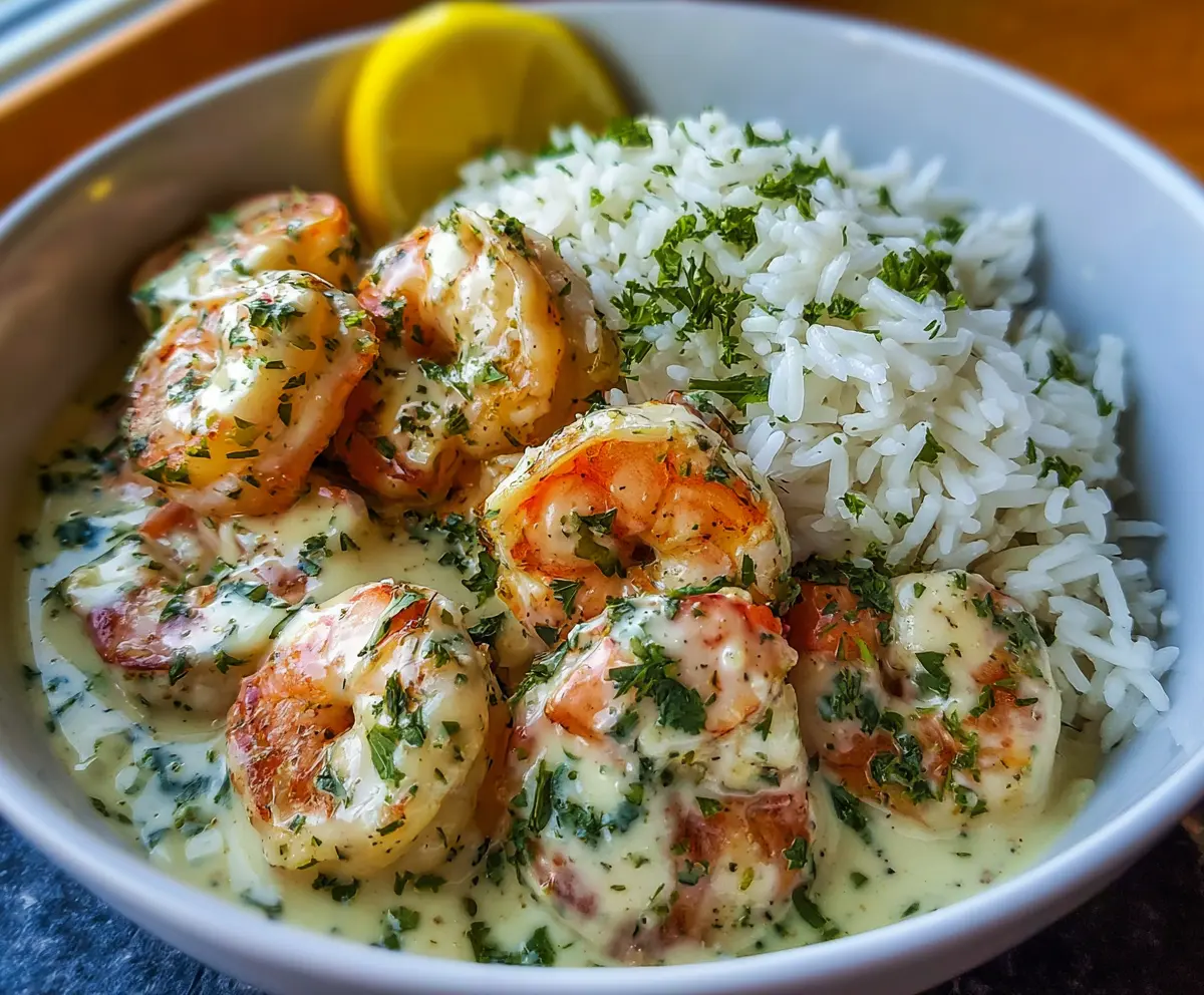 This recipe yields a comforting, flavorful bowl full of tender shrimp in a luscious herb garlic cream sauce, perfectly complemented by fragrant herb rice. Enjoy!