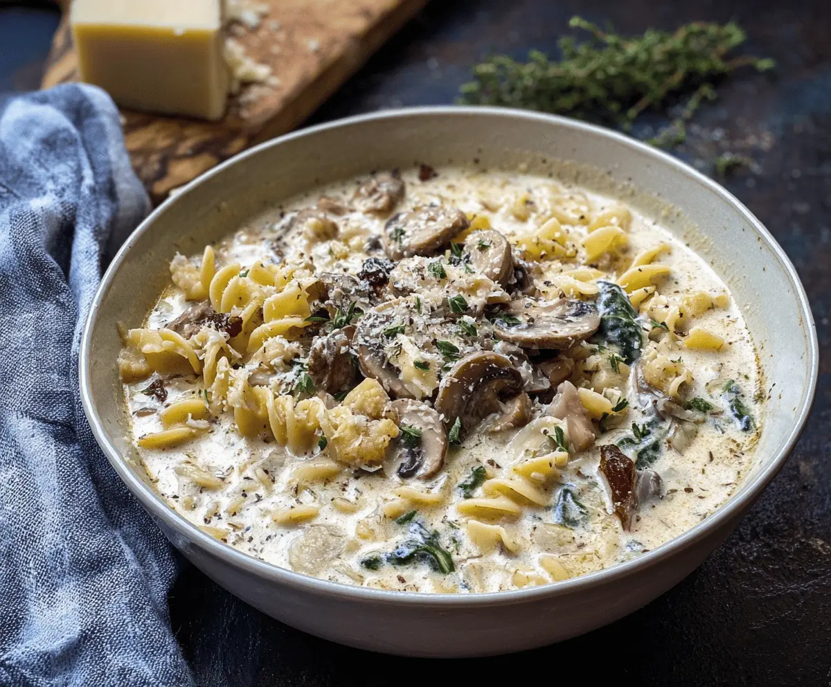 This soup captures the flavors of mushroom lasagna in a creamy, comforting broth, with tender pasta and fresh greens. Enjoy!