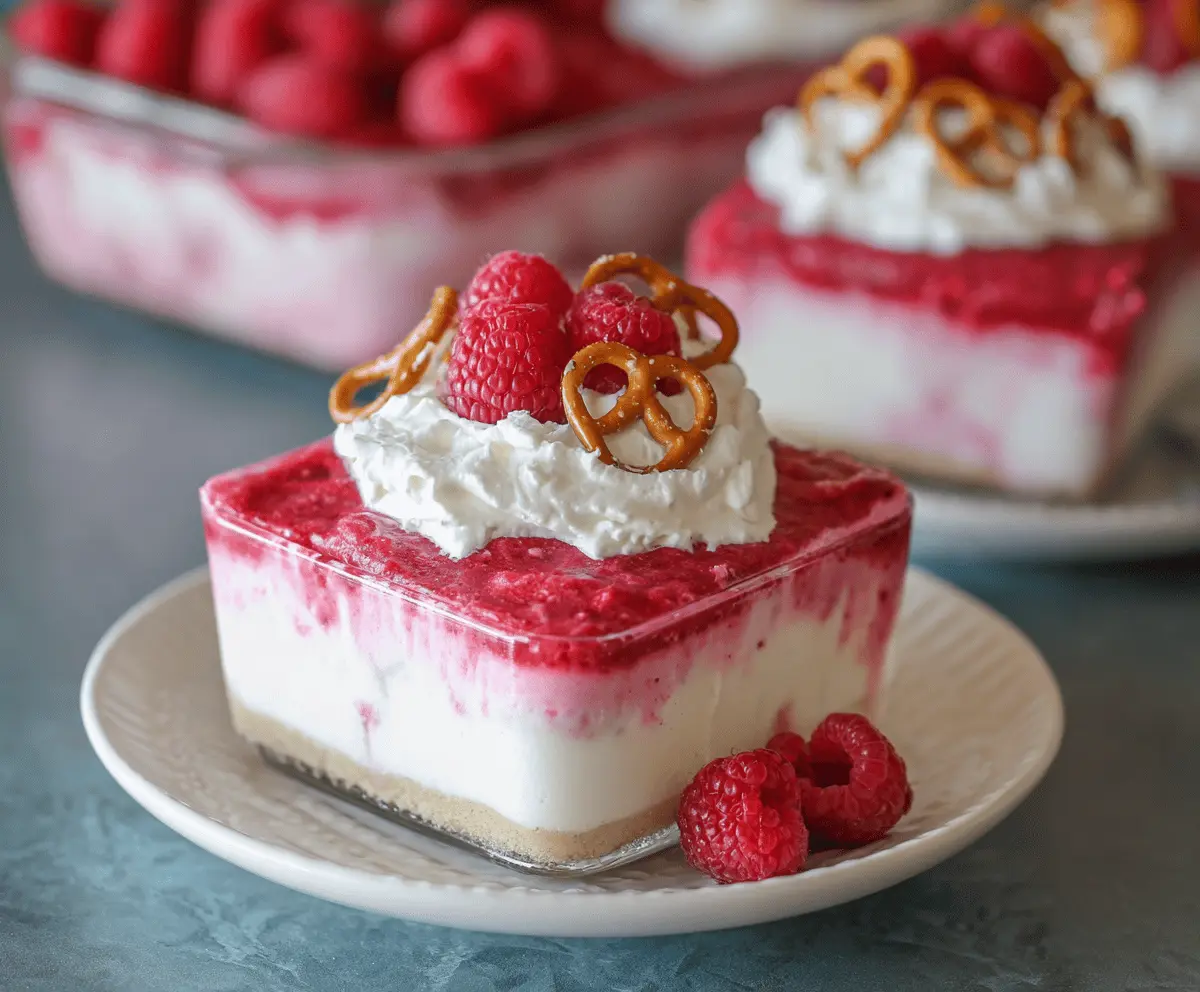 Enjoy this delightful mix of salty pretzel crunch, cheesecake-like cream, and fruity raspberry topping! Your guests will love it! 🎉
