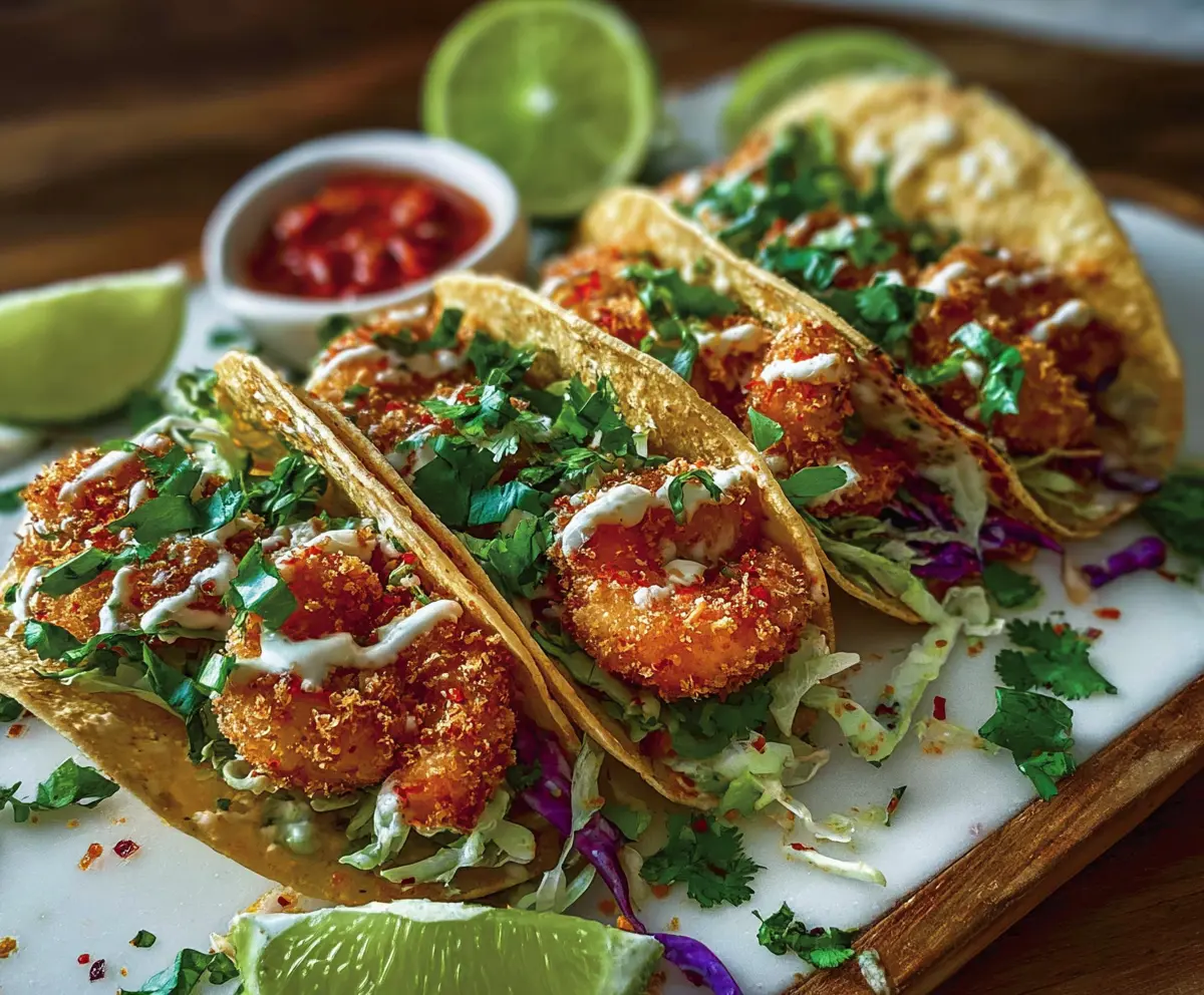 These crispy coconut shrimp tacos are a fun twist on taco night! Juicy shrimp are coated in crunchy coconut and served in soft tortillas with fresh toppings.