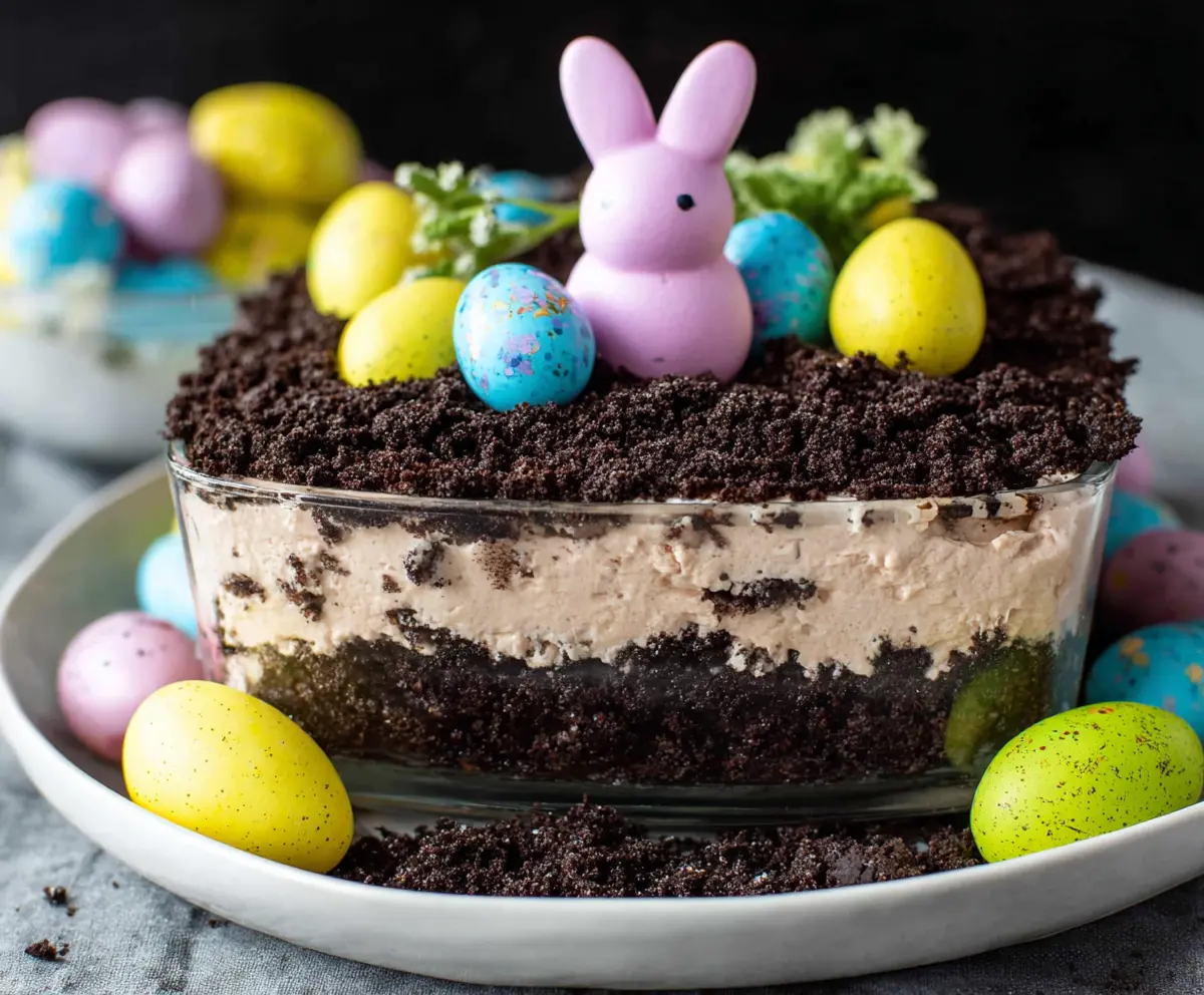 This Easter Dirt Cake combines rich chocolate cookie crumbs with creamy, layered fillings and festive decorations for a delightful and fun holiday treat. Happy Easter!