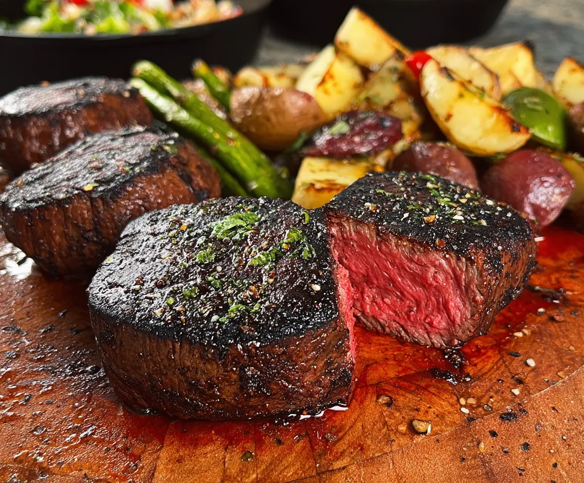 Now you can enjoy a perfectly tender and juicy filet mignon with savory roasted potatoes and crisp asparagus—a restaurant-quality meal made right at home!