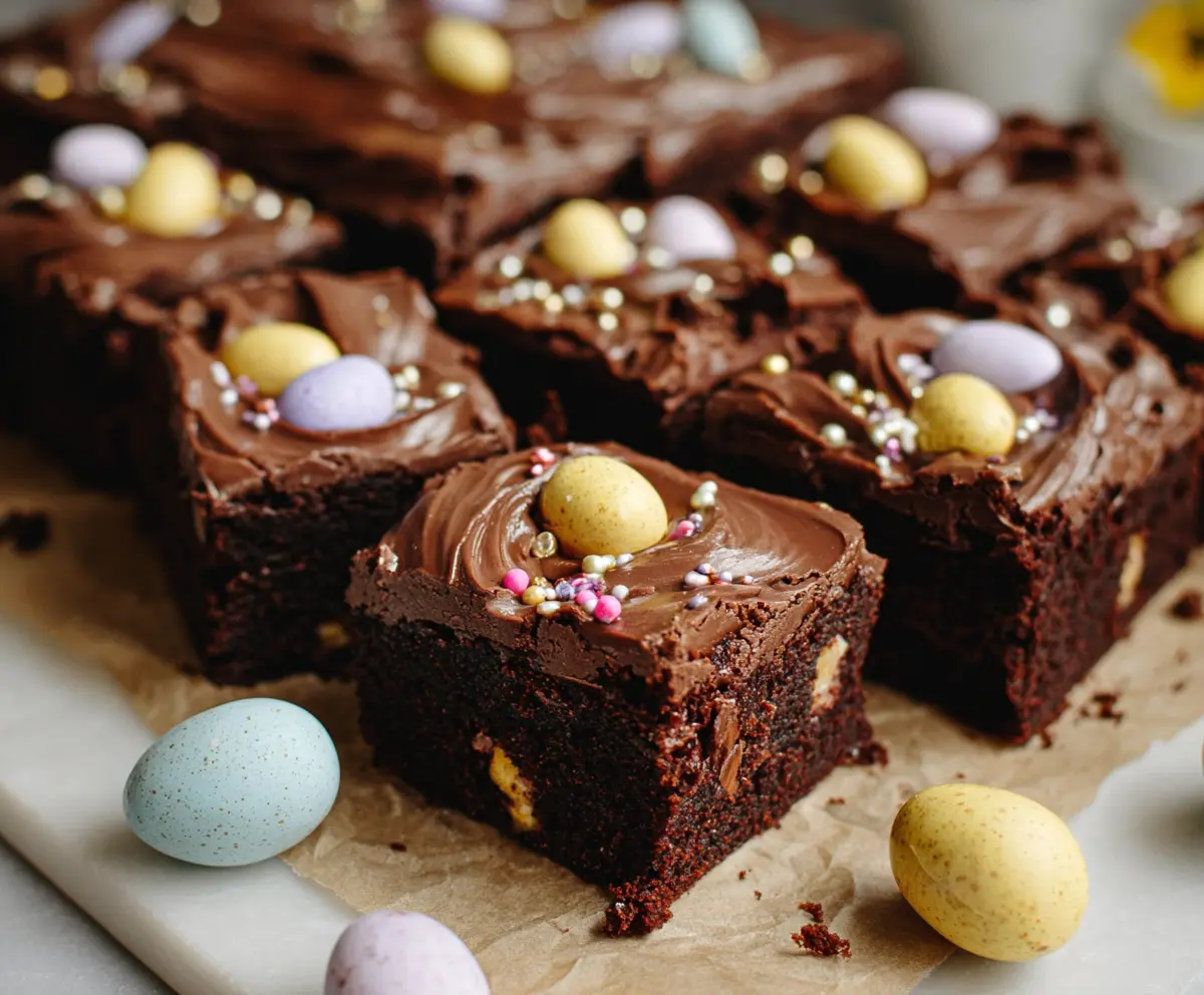 Who can resist a chewy brownie topped with chocolate frosting and those adorable mini eggs? I like to cut them into bite-sized squares, so I can eat *just one more*! 😋