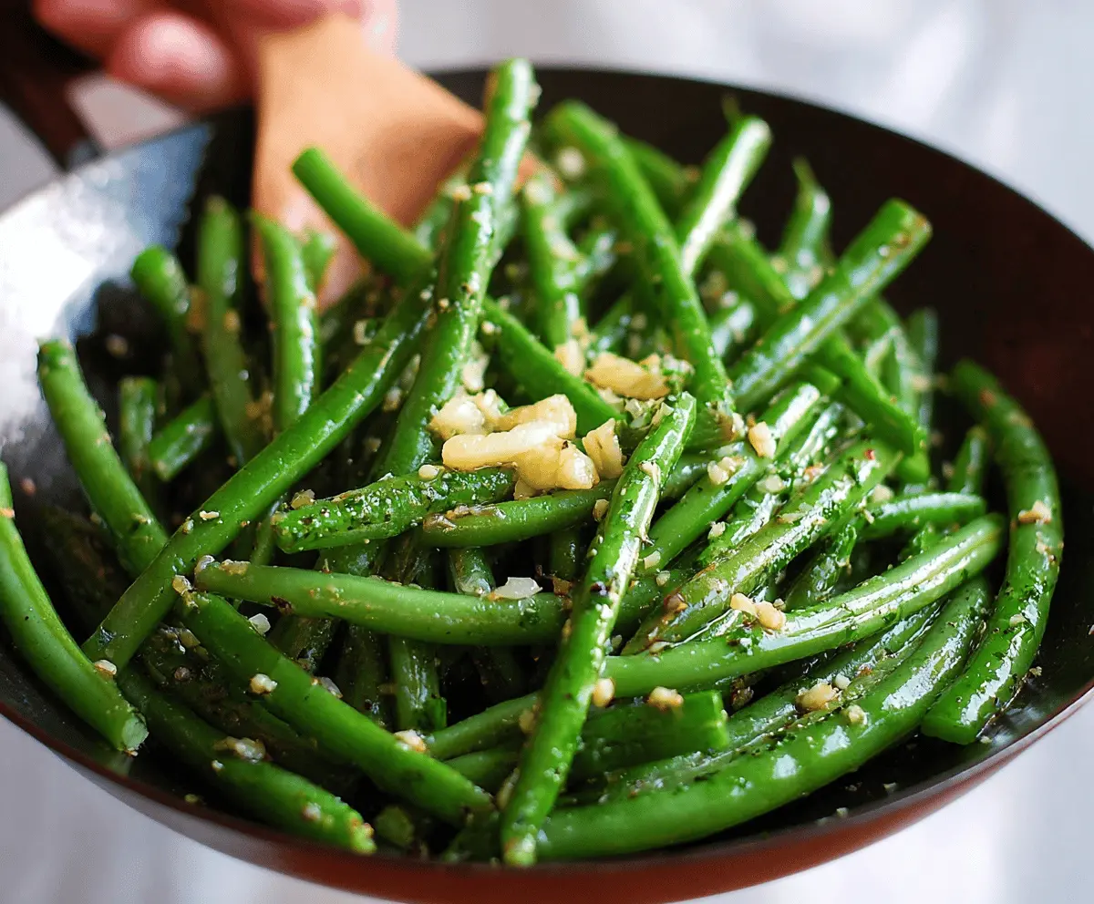 Fresh green beans cooked with garlic and butter, garnished for a delicious garlic butter green beans side dish.