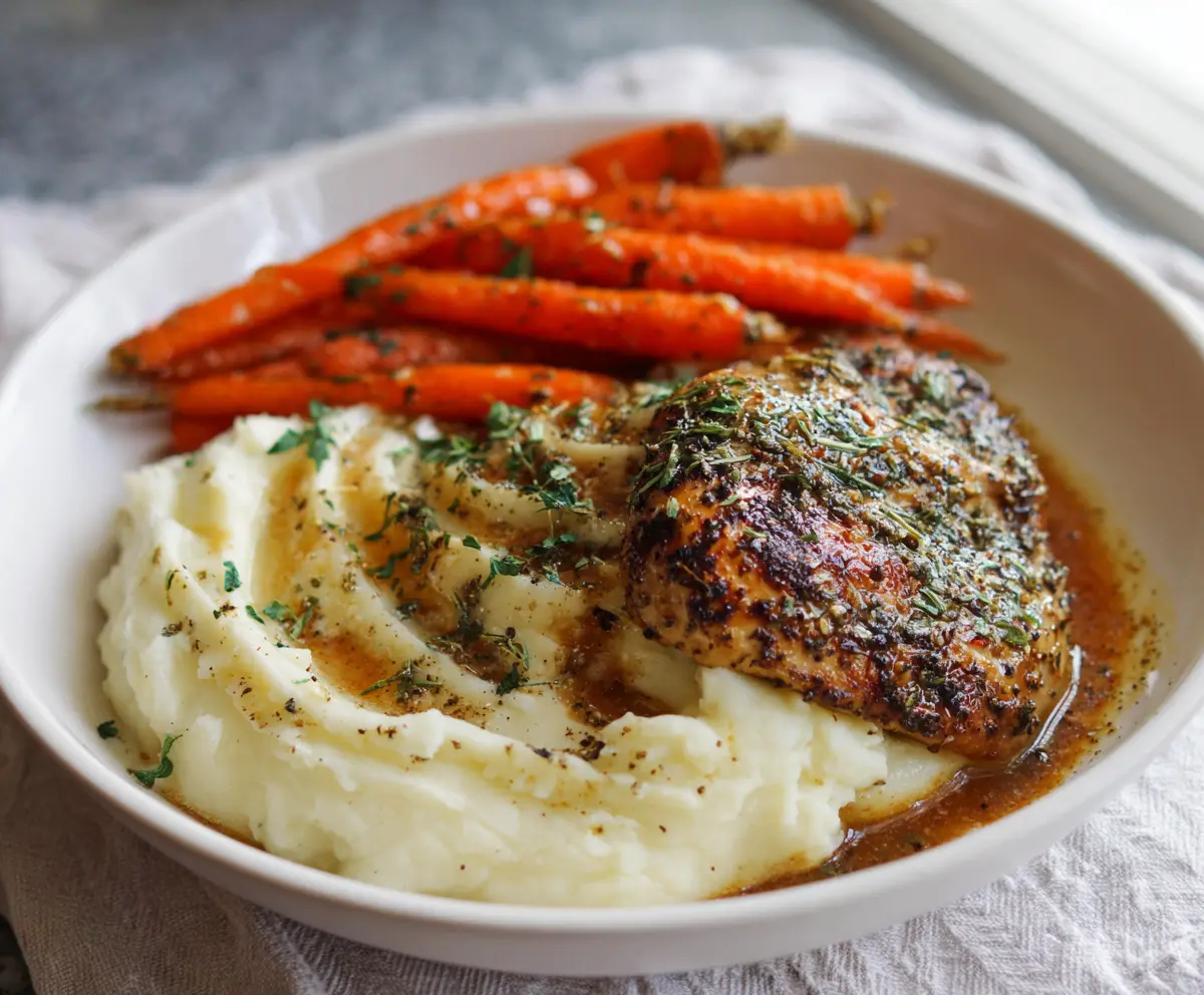 This Garlic Herb Chicken is juicy and bursting with flavor, seasoned perfectly with herbs. Paired with creamy mashed potatoes and sweet glazed carrots, it’s a comforting meal!