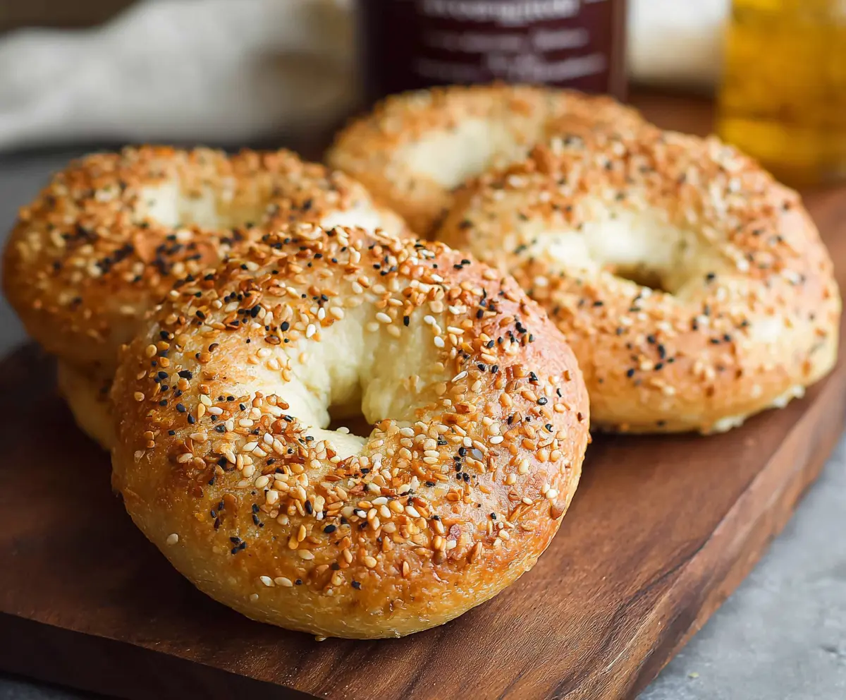 To keep your bagels tender, avoid overmixing and let them cool on a wire rack after baking. You can also brush them with olive oil before baking for a moist, tender crust!