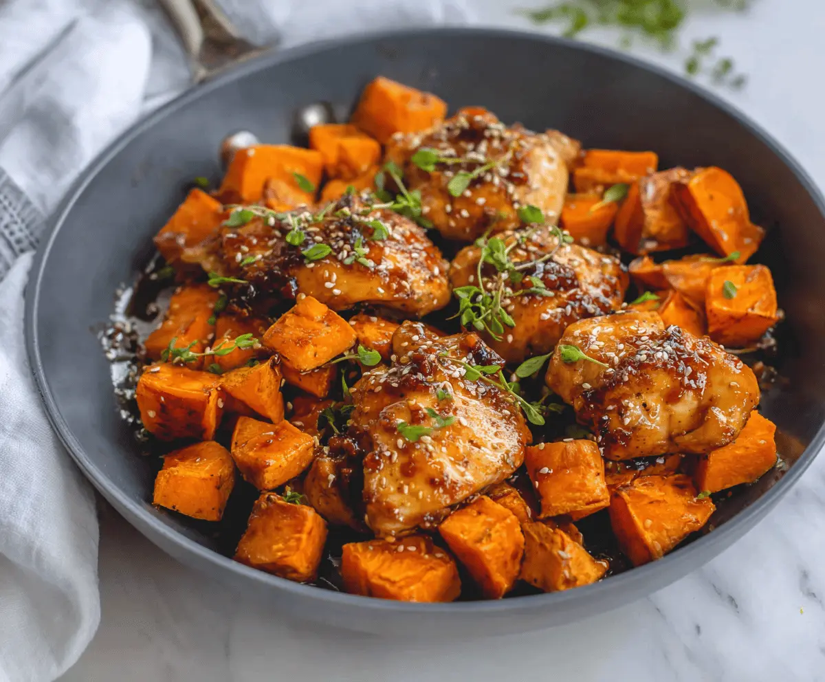 I love how easy this dish is to prepare. Just marinate the chicken, throw it in the oven with the sweet potatoes, and enjoy the tasty aroma while it cooks. Perfect for busy days!