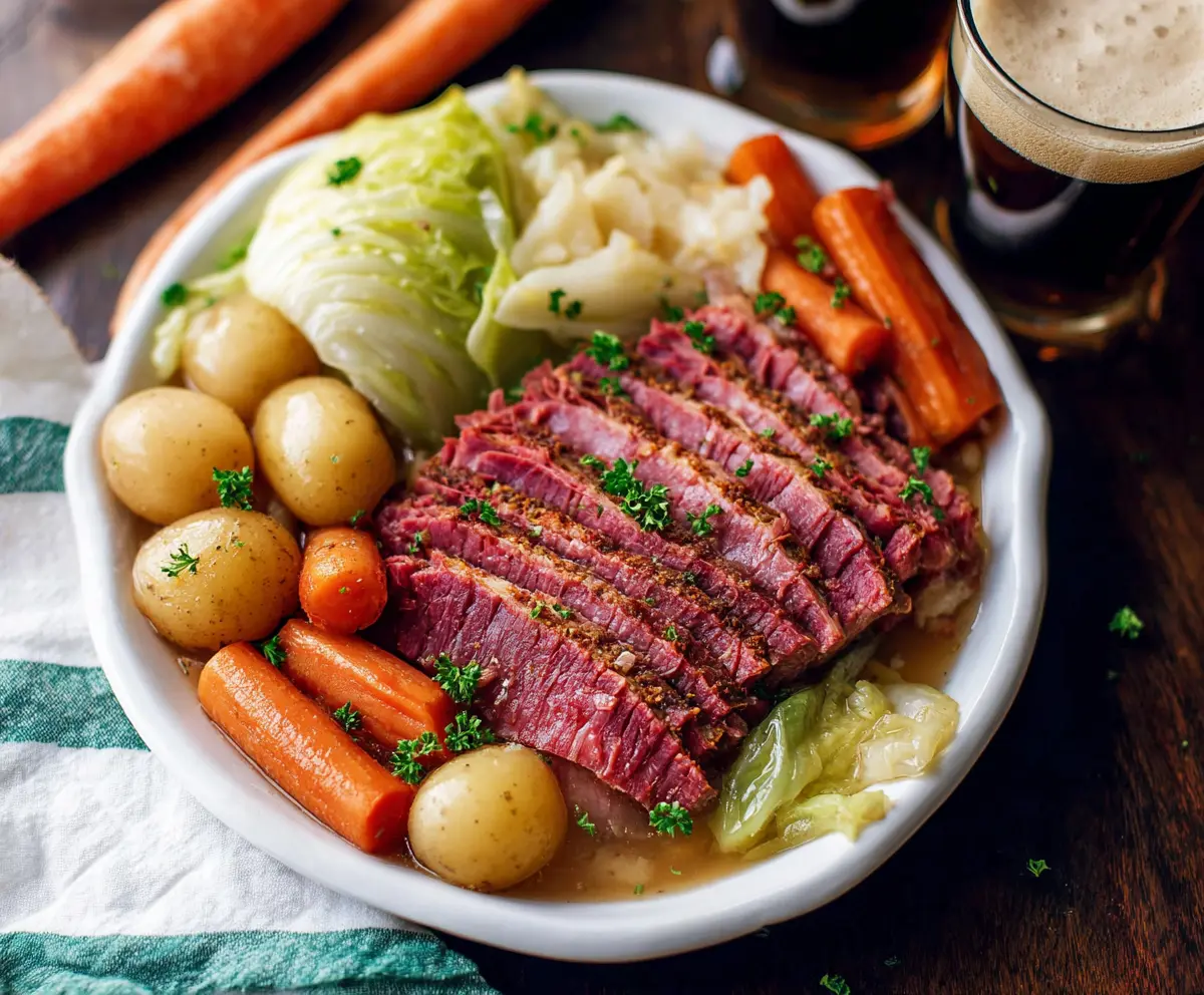 Arrange your sliced corned beef with the potatoes, carrots, and cabbage on a serving platter. Don’t forget to sprinkle some chopped parsley on top for a fresh touch. You can serve this delicious meal with mustard or horseradish sauce if you like!