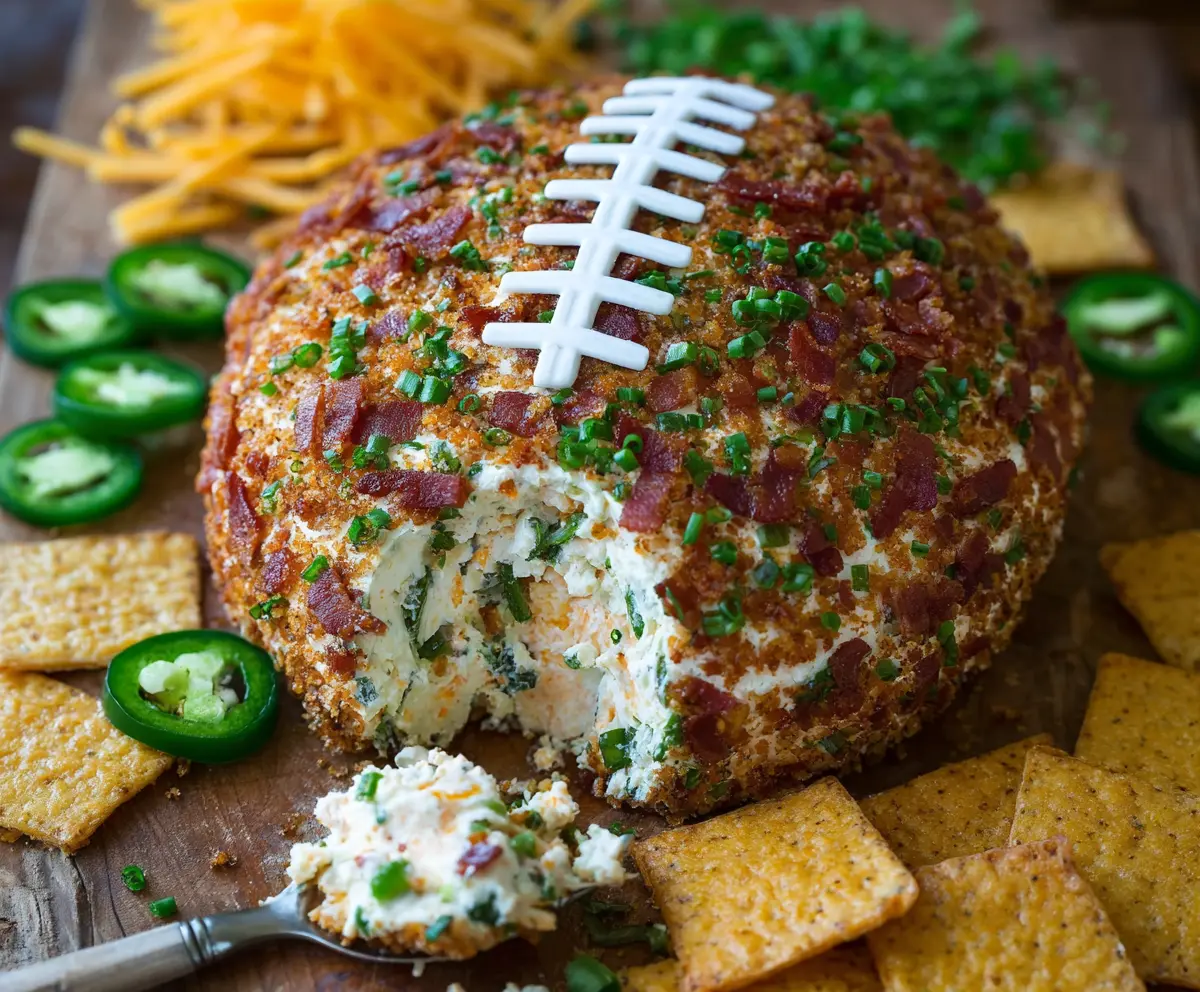 Everyone loves a good cheese ball, and this one packs a kick! I love serving it with crunchy crackers—perfect for snacking while cheering on your favorite team. 🏈