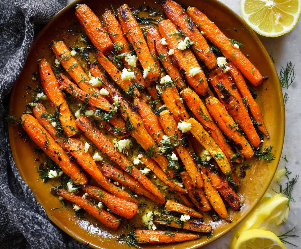Once roasted, remove the carrots from the oven and transfer them to a serving platter. Sprinkle the chopped fresh dill over the top for a burst of flavor and color. Finish by garnishing with crumbled feta cheese and lemon wedges around the plate. Serve warm and enjoy your delicious Lemon Dijon Roasted Carrots!