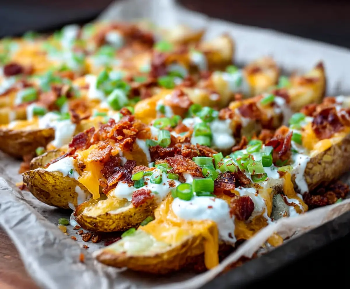 After baking, let them cool slightly. Drizzle the sour cream over the cheesy, bacon-topped wedges and sprinkle with fresh chives or green onions for that burst of color and flavor.
