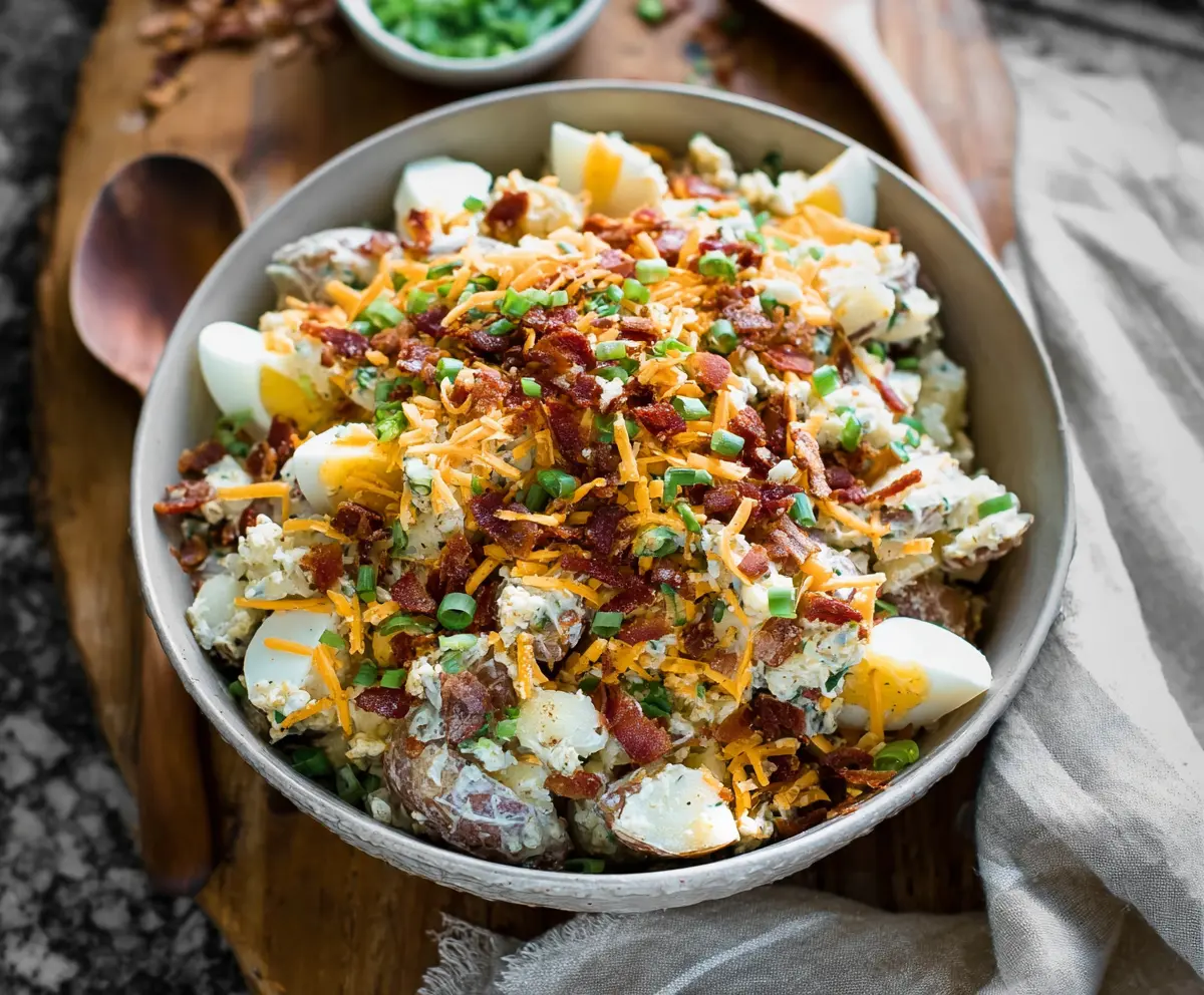 Enjoy your loaded potato salad, packed with creamy goodness, crispy bacon, and a burst of flavor from the fresh green onions!