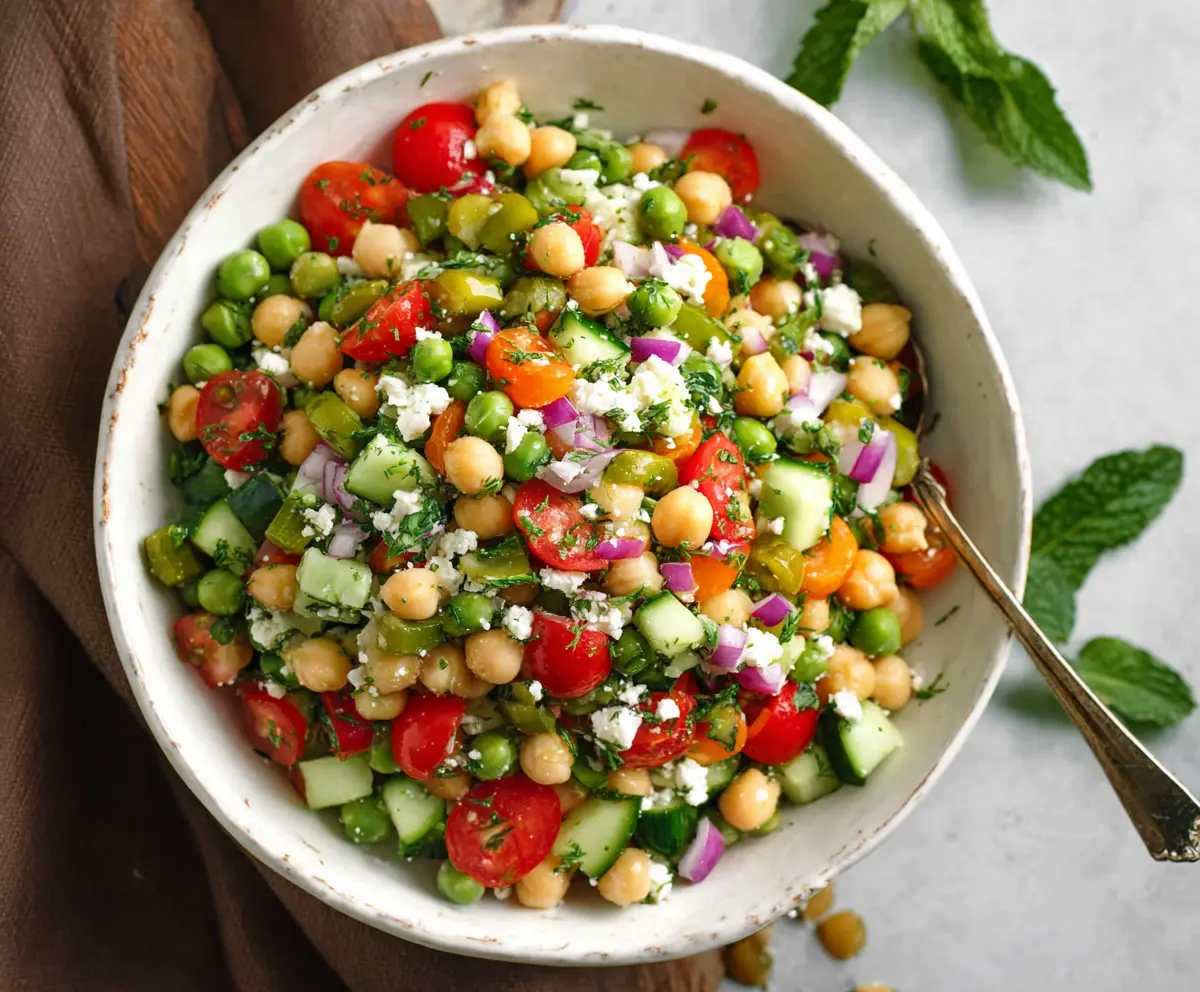 In a large salad bowl, add the drained chickpeas, thawed peas, halved cherry tomatoes, diced cucumber, and thinly sliced red onion. This colorful mix will be the base of your salad!