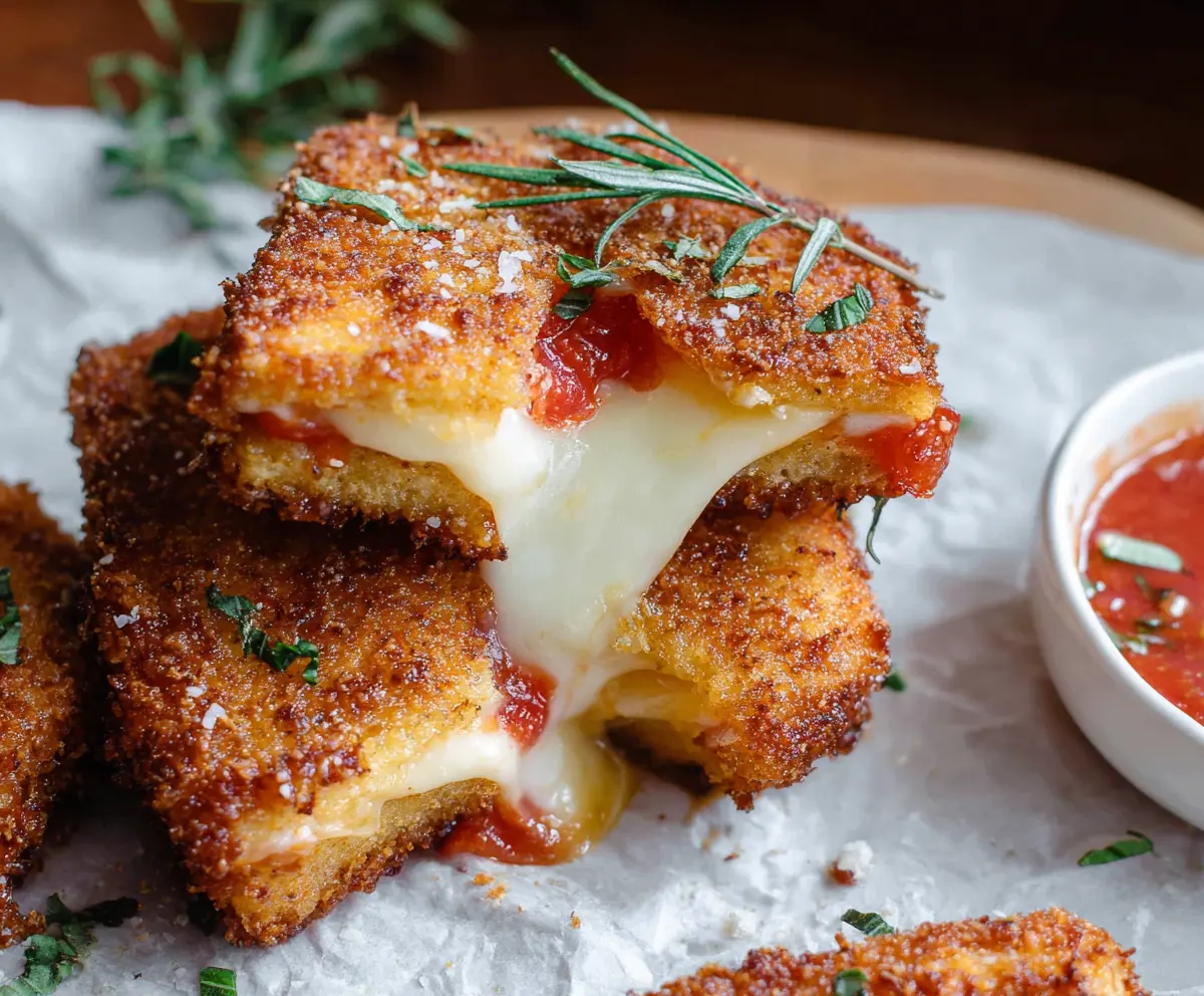 Garnish with fresh basil leaves and serve immediately with warm marinara sauce for dipping. Enjoy this crispy, cheesy delight!