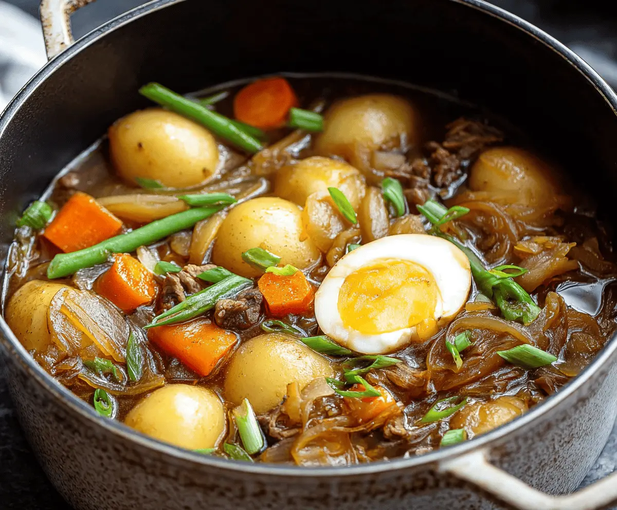 Transfer the Nikujaga to serving bowls. For a special touch, garnish with sliced green onions and add half a soft-boiled egg on top of each bowl if you like!