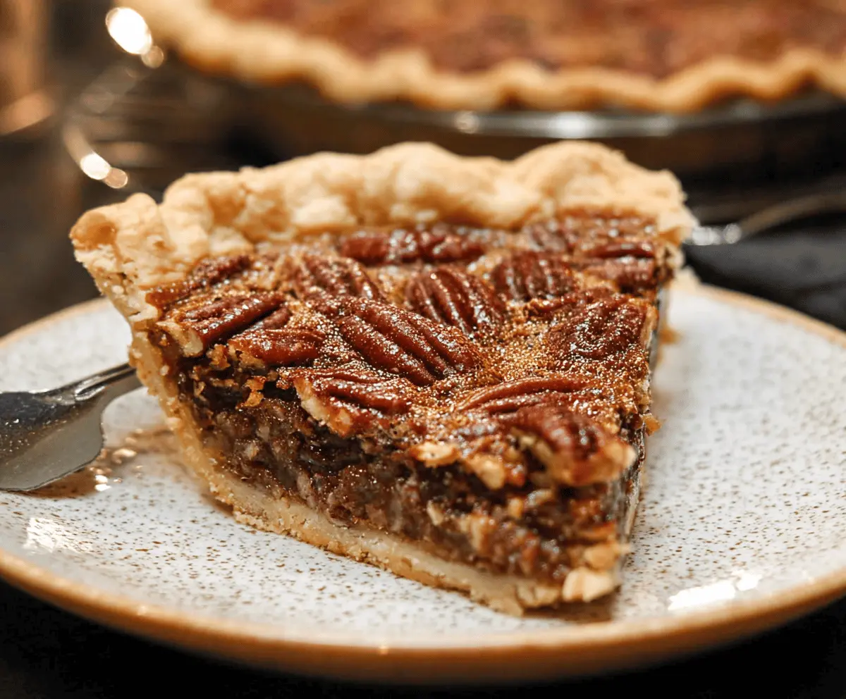 Delicious homemade pecan pie topped with caramelized pecans and a flaky golden crust, perfect for dessert.