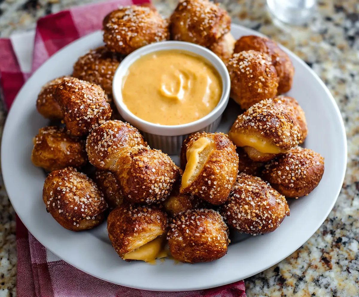 Enjoy these soft, golden pretzel bites dipped into the rich, flavorful cheddar sauce—a perfect snack or appetizer for any occasion!
