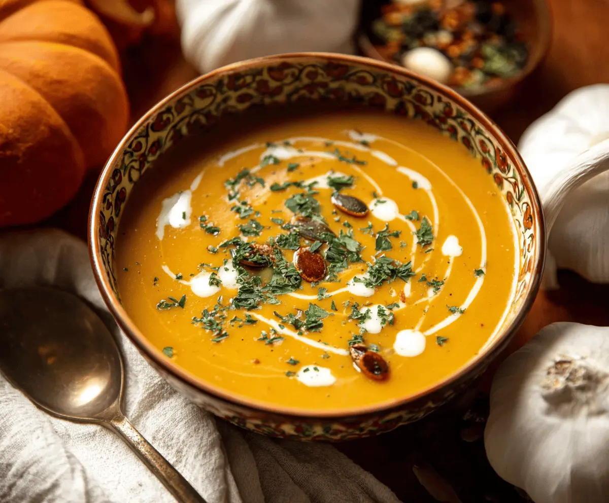 Creamy pumpkin soup garnished with fresh herbs and a swirl of cream in a rustic bowl, perfect for fall comfort food.