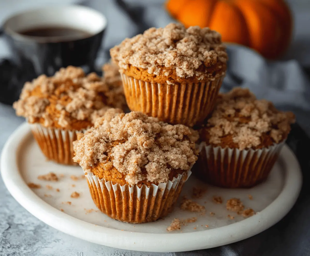 Freshly baked Pumpkin Streusel Muffins with a golden crumb topping on a rustic plate, perfect for fall breakfast or snack.