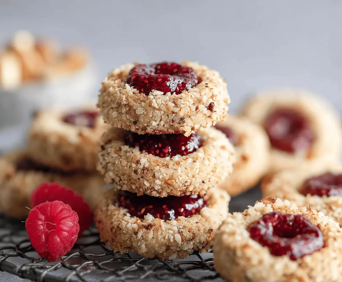 Delicious raspberry and hazelnut thumbprint cookies arranged on a white plate, showcasing a golden-brown crust and berry filling.