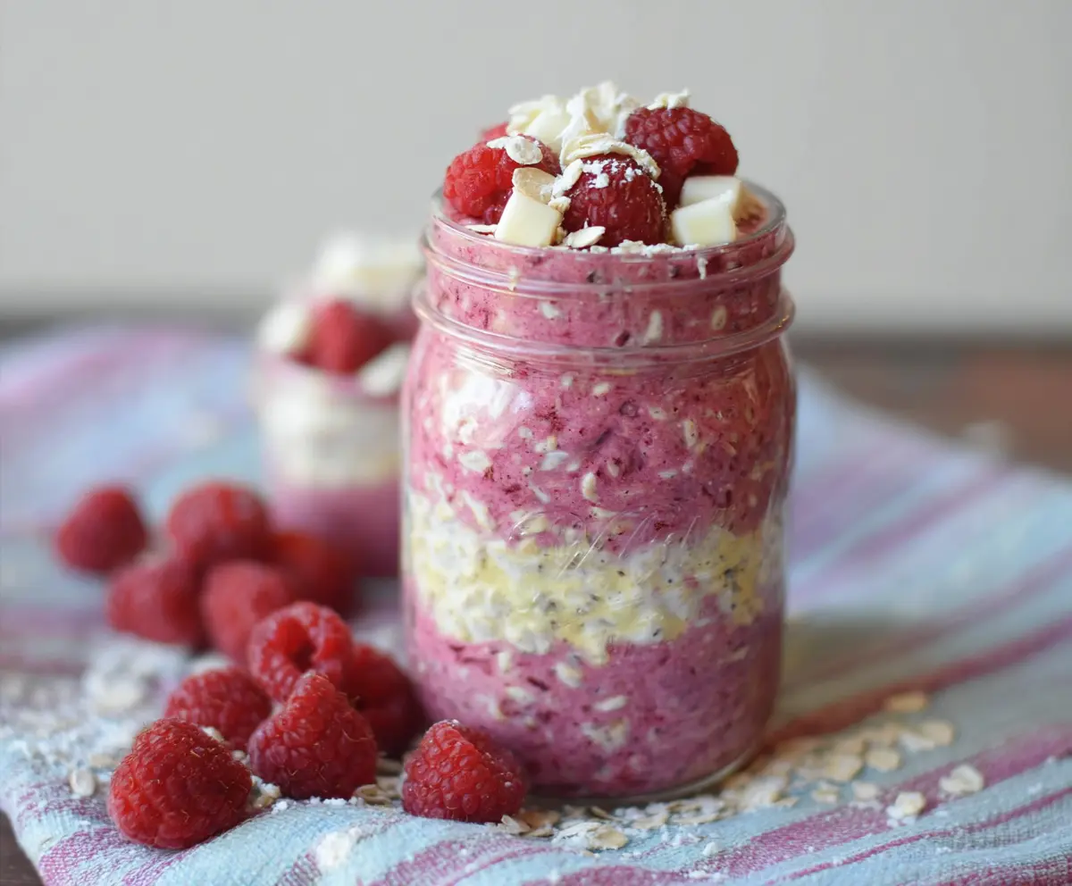 Absolutely! Frozen raspberries work well in this recipe. Just be sure to thaw them first and drain any excess liquid before mashing. This helps maintain the right consistency in your overnight oats.