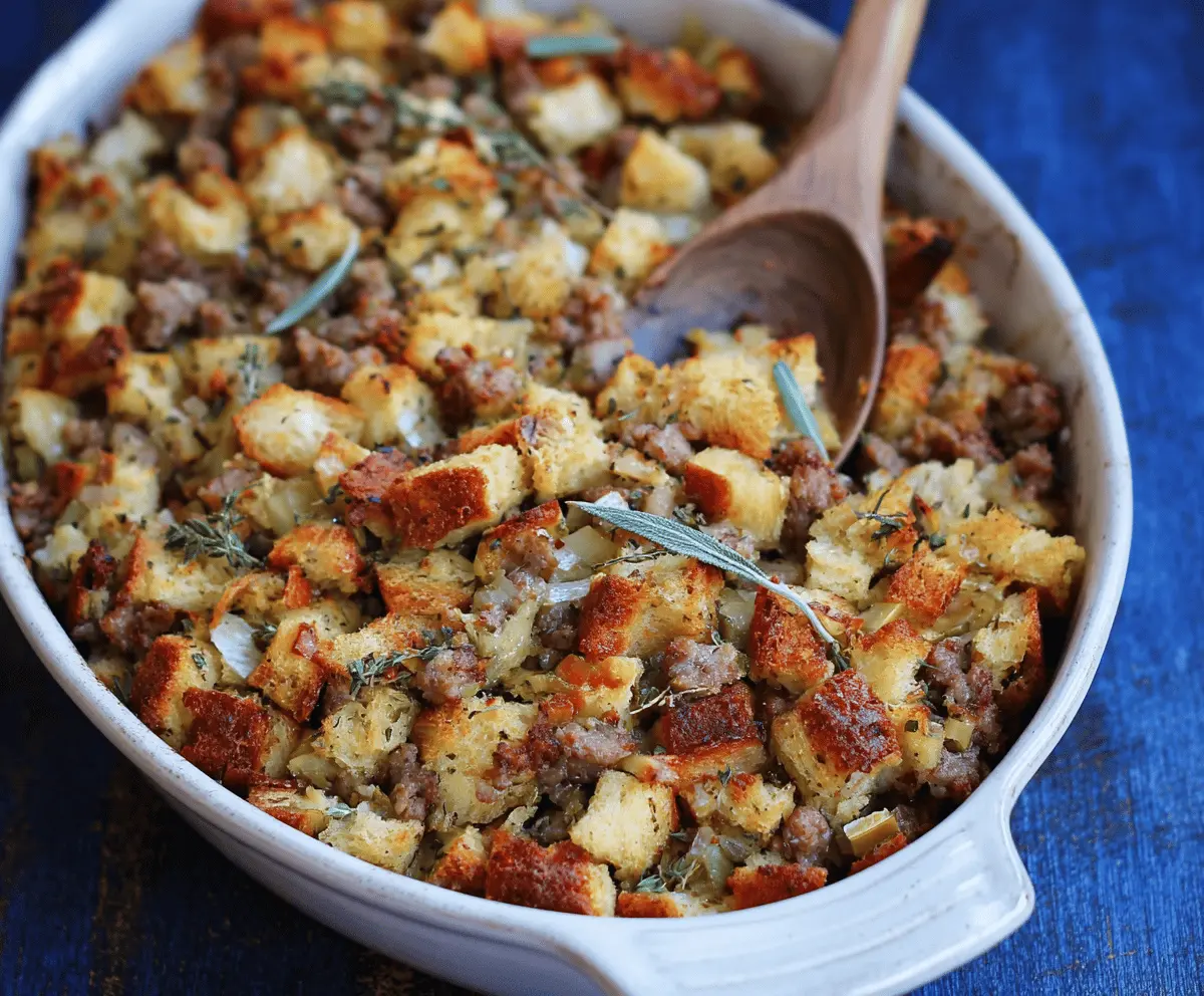 This delicious sausage, apple, and sage stuffing is perfect for any family meal or holiday gathering. It’s packed with savory sausage and sweet apples, creating a tasty mix!