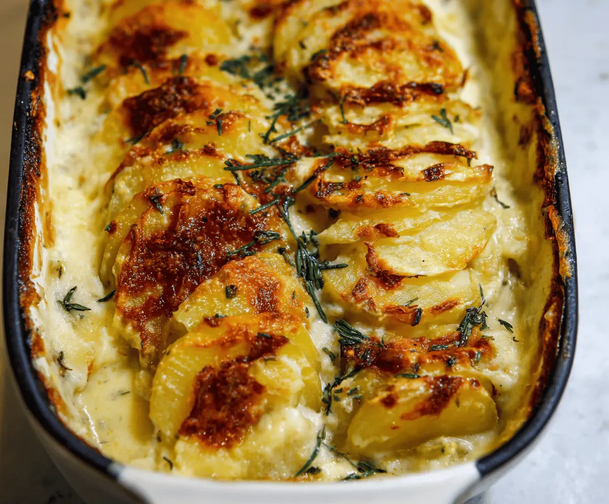 Creamy scalloped potatoes baked to perfection with golden cheese crust, served in a casserole dish, ideal for comforting side dishes.