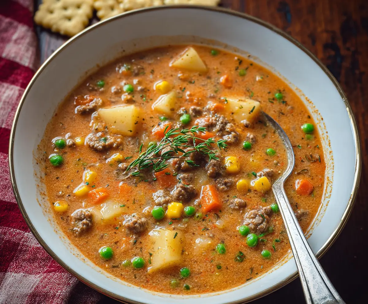 Making this soup is super easy and quick! Just cook the meat and veggies, toss in some broth, and finish with those mashed potatoes. Perfect for a chilly day!