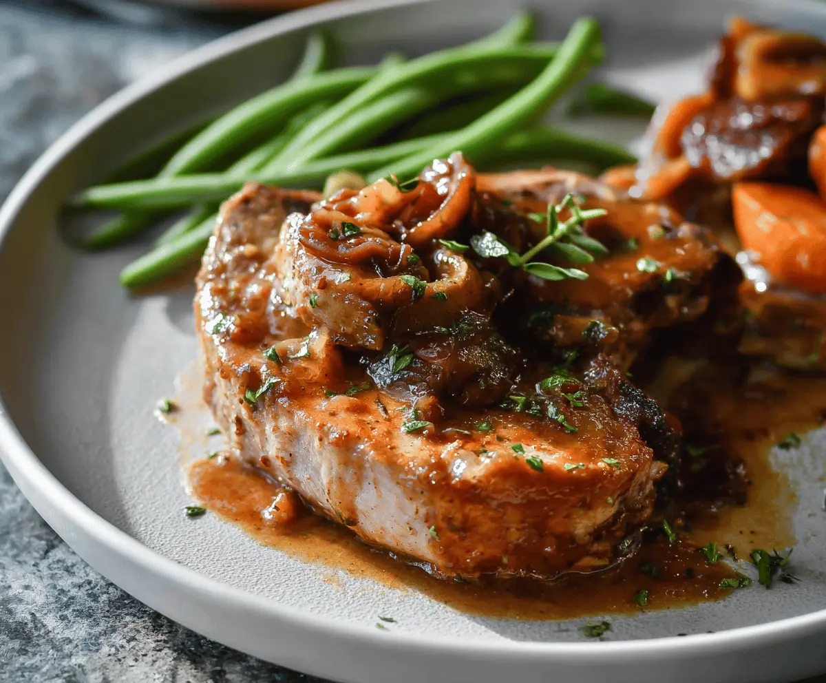 Juicy slow cooker pork chops served with fresh herbs and vegetables for a flavorful homemade meal