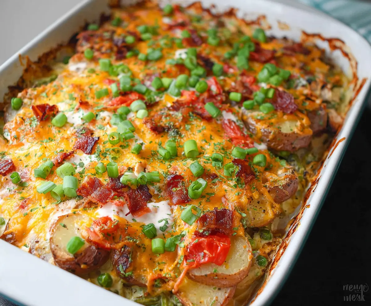 Once you take it out of the oven, immediately top the casserole with crumbled bacon and chopped green onions for a fantastic finish. Let it rest for about 5 minutes to allow the flavors to meld before serving.