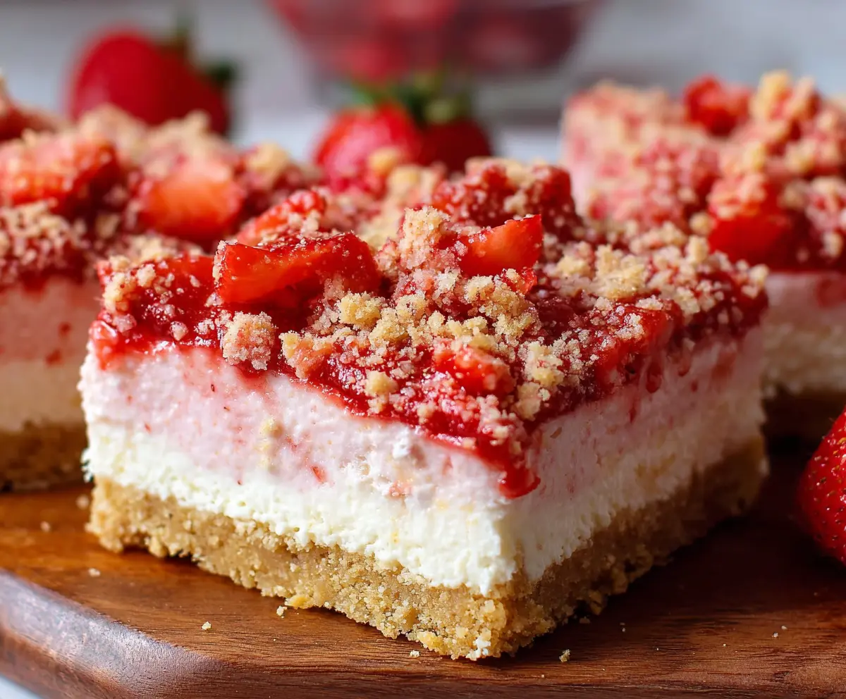 When you’re ready to enjoy, take it out of the fridge and cut the bars into squares. Serve them chilled and feel free to garnish with fresh strawberries or a light dusting of powdered sugar for that extra touch!