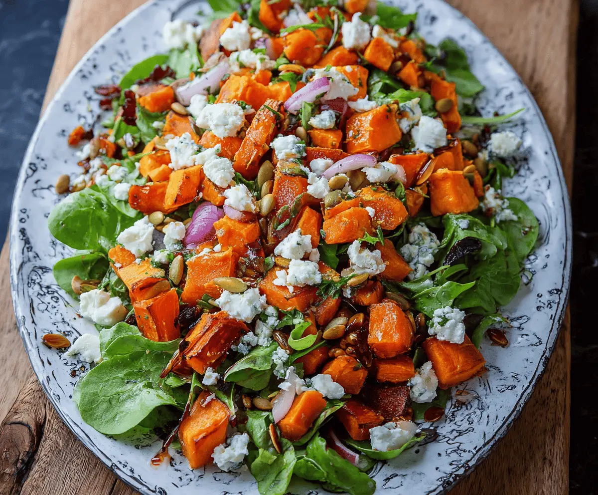 On a large serving platter or bowl, arrange the fresh arugula or mixed greens as the base. Layer on top the roasted sweet potatoes, sautéed red onions, dried cranberries or raisins, toasted pumpkin seeds, and crumbled feta cheese.