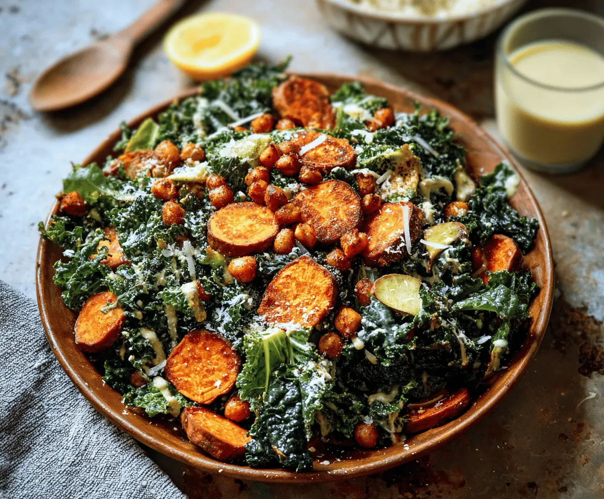 This Sweet Potato Kale Caesar Salad is a fun twist on a classic! It combines creamy dressing with crunchy kale and roasted sweet potatoes for a treat that’s both tasty and healthy.