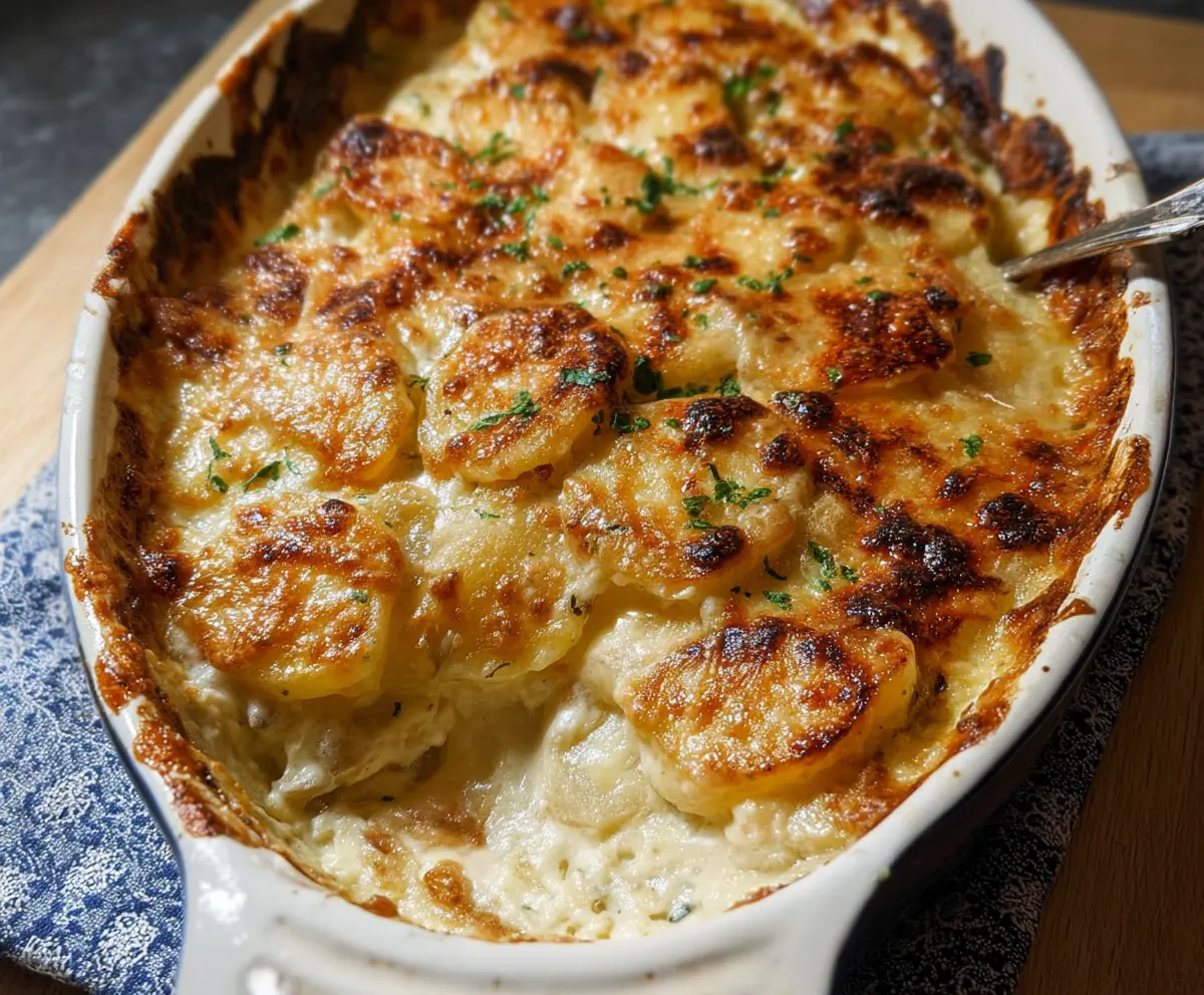 Let the scalloped potatoes sit for about 10 minutes before serving. This helps everything settle. Before you serve, sprinkle fresh parsley on top for a pop of color and flavor!