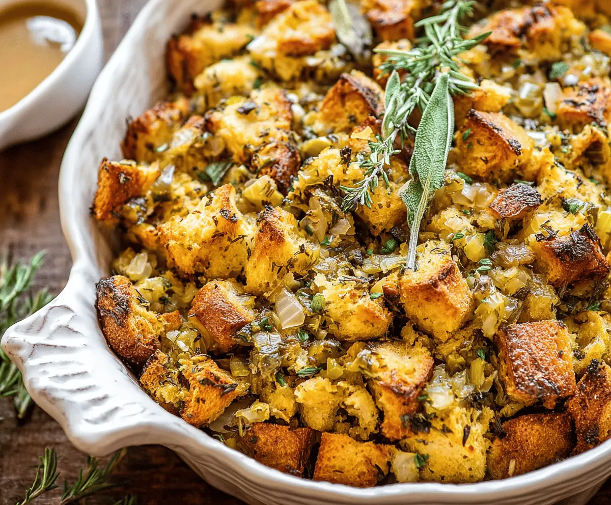 Once baked, remove the stuffing from the oven and let it sit for a few minutes before serving. This classic stuffing is a perfect companion to your turkey and all your festive sides. Enjoy your Thanksgiving feast!